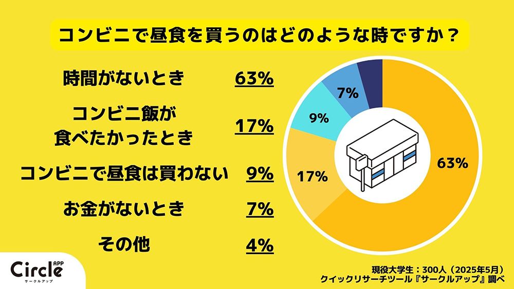 どんなときにコンビニ弁当を買うかを聞くと、63パーセントともっとも多かったのが「時間がないとき」だった。コンビニ弁当が食べたくて買うという人は17パーセントと少数だ。