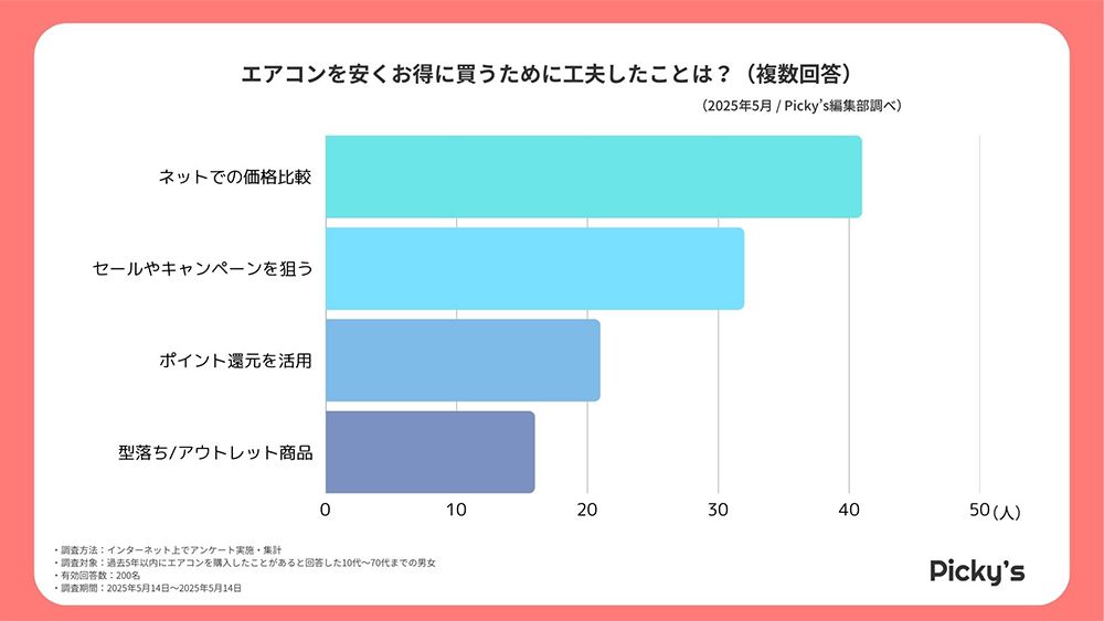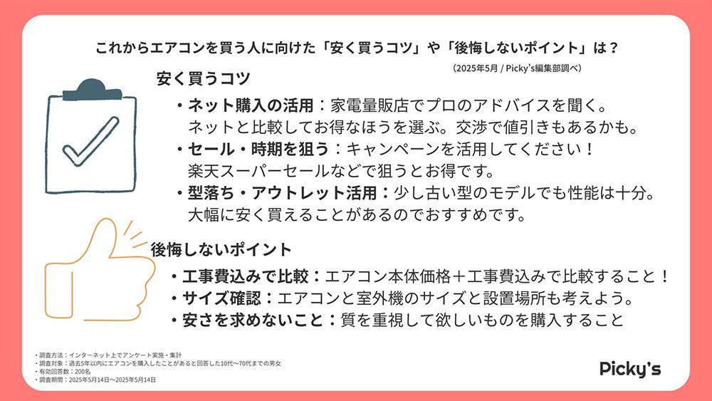 Picky'aは「ネット比較×セール活用×ポイント還元の三段構え」がエアコン選びの新常識だと言っている。そのためには、じっくり機種選定を行い、いつどこで、どうやって買うかをしっかり調べておくことが重要だ。つまり、じっくり腰を据えて計画的に買うというのが基本だ。