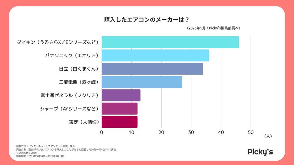 ネット通販に特化した買い物情報サイト「Picky's」と「Picky's Life」は、エアコンを購入した200人を対象に、コスパ重視のエアコン選びについて調査した。調査対象者が買ったエアコンは6〜8畳用のものが中心で、工事費込みで10万円以下の機種でも十分に満足できるモデルが選ばれているという。ただし、16畳以上の部屋になると、あまり安いものは電気代や性能など、口コミでしっかり調べることが大切だとのこと。