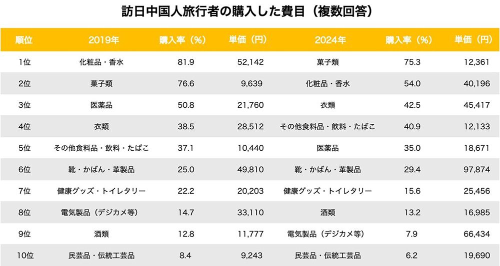 買い物の内容も変化している。2019年は化粧品や香水がトップだったが、2024年は菓子類がトップに躍り出た。これは、化粧品や医薬品が中国国内や越境ECで簡単に手に入るようになったことから、「その場でしか買えない限定商品の価値」に関心が移ったためだとUnbotは分析してる。