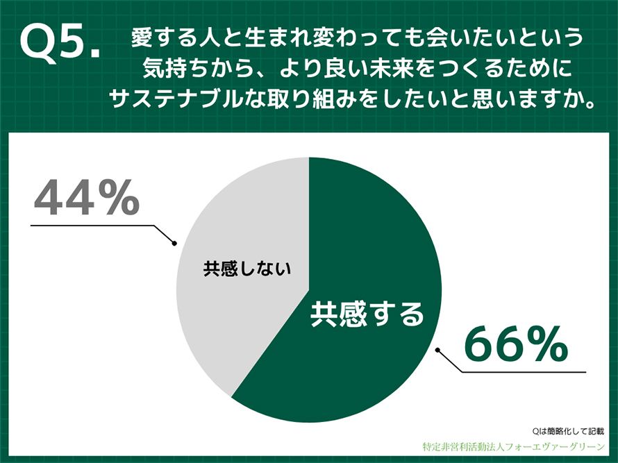 さらに、生まれ変わっても愛する人に会える未来を作るために、サステナブルな取り組みをしたいかと尋ねると、66パーセントが共感した。これはイベントのテーマを支持するうれしい結果だ。