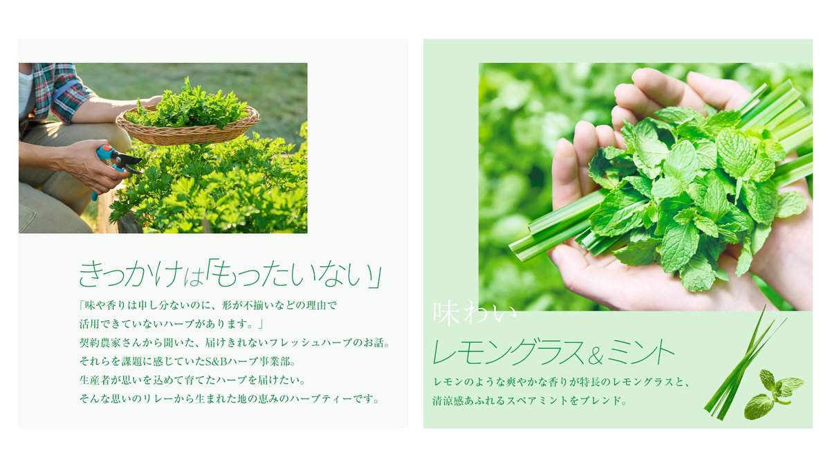 原料のハーブは、同社のフレッシュハーブ事業における未活用原料をアップサイクル。形が不揃いなどの理由でこれまで十分に活用されてこなかったハーブから新たな製品を作り出すことで、契約農家が抱えていた悩みの解決にもつながっているという。