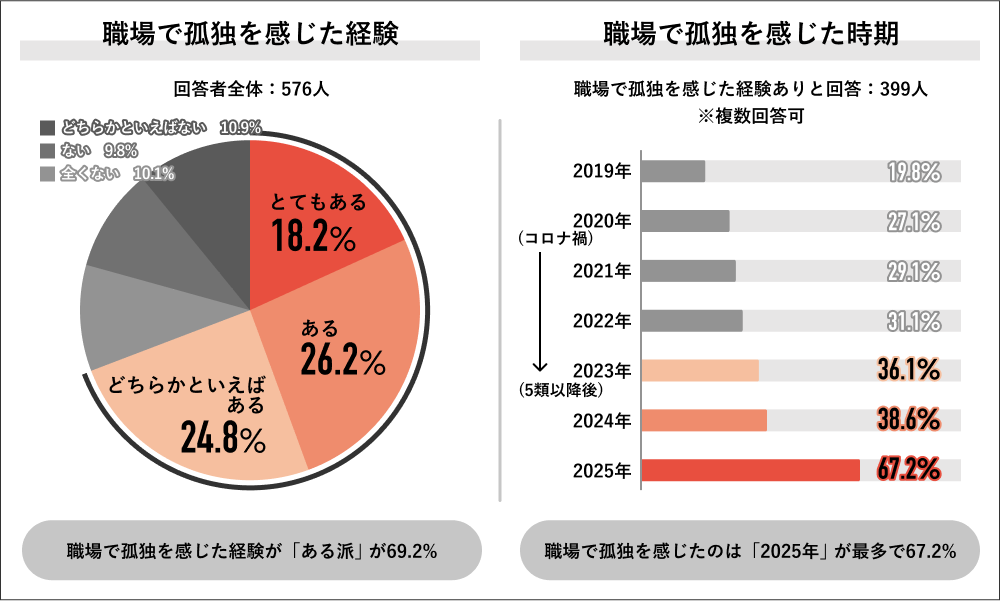 職場における孤独の実態調査によると、回答者576人のうち69.2%が職場で孤独を経験。特にコロナ禍のリモートワークから出社回帰が進んだ2023年以降に急増し、2025年には前年比でもっとも大きな伸びを記録した。リモートワーク時の「物理的に孤独」な状態から、出社再開後の「リアルな職場でのコミュニケーションの難しさ」へと、孤独の質が変化していることが透けてみえる。