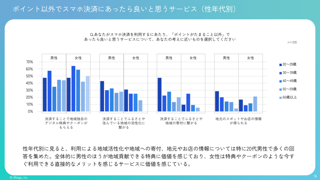 一方、女性は「地域独自のクーポン」「イベント参加特典」など、いますぐ使える具体的なメリットへのニーズが高かった。とくに商店街の割引や花火大会の座敷席の優待など、生活に直結するお得さが支持されている。