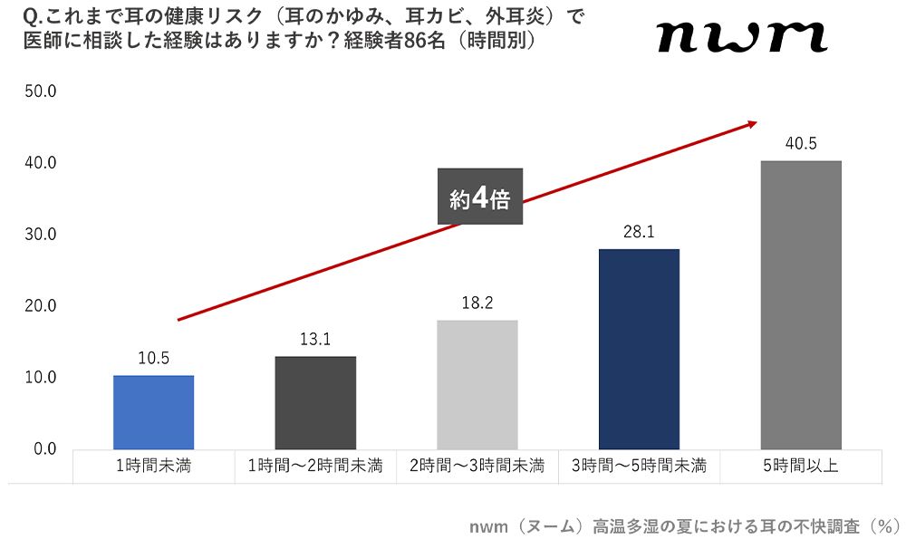 この調査結果を受けて6月19日にNTTソノリティが開催したラウンドテーブルでは、そらいろ耳鼻咽喉科センター北駅前院院長の内尾紀彦医師が、耳トラブルに関する解説を行った。それによると、イヤホンの使用が5時間を超えると、耳カビ、外耳炎、耳のかゆみなどの発症が、1時間未満の人の約4倍に増えるということだ。