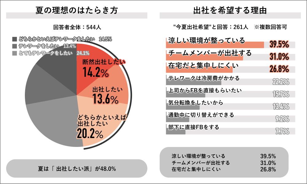 では、夏の理想の働き方としては、「断然出社したい」「出社したい」「どちらかといえば出社したい」という出社したい派は48.0%と約半数いた。その理由として、「涼しい環境が整っている」が39.5%、「チームメンバーが出社する」が31.0%、「在宅だと集中しにくい」が26.8%と続いている。