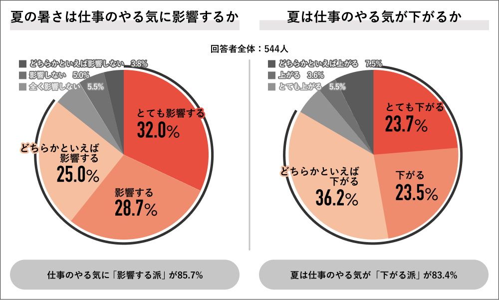 夏の暑さに対しての仕事のやる気は影響するかの問いに対し、「とても影響する」「影響する」「どちらかといえば影響する」を合わせると85.7%の人が影響すると回答。仕事のやる気に対しても「とても下がる」「下がる」「どちらかといえば下がる」を合わせて73.4%が下がるということで、夏の暑さをどう凌ぐかが、仕事のやる気に直結するようだ。