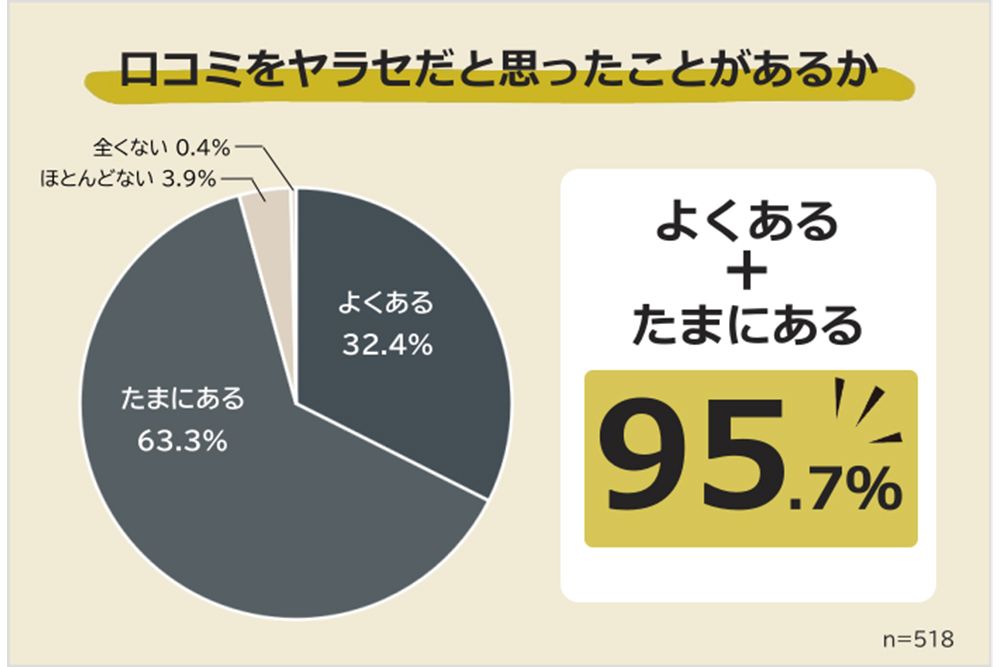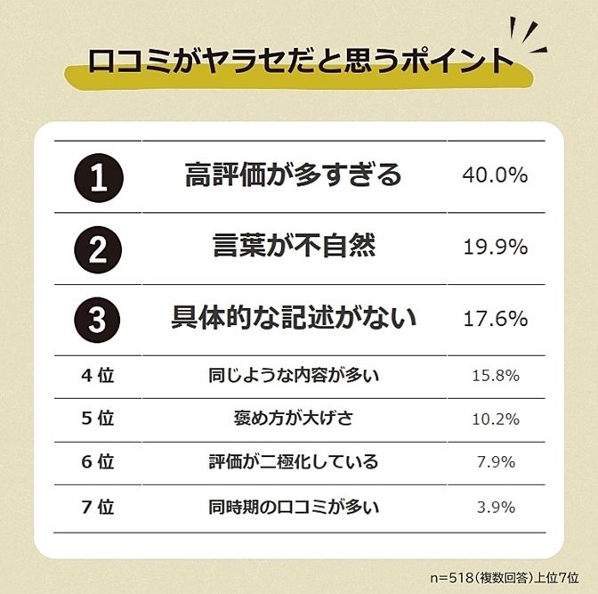 気になる口コミ探索サービス「みん評」を運営するマイスタースタジオは、10代以上の全国の男女518人を対象に、ヤラセ口コミに関する意識調査を実施した。すると、じつに95パーセント以上の人が、口コミを読んでヤラセだと感じたことがあると答えている。ヤラセだと感じた理由から、さまざまなヤラセのパターンが浮かび上がる。ここに理由の1位から7位の内容を紹介しよう。