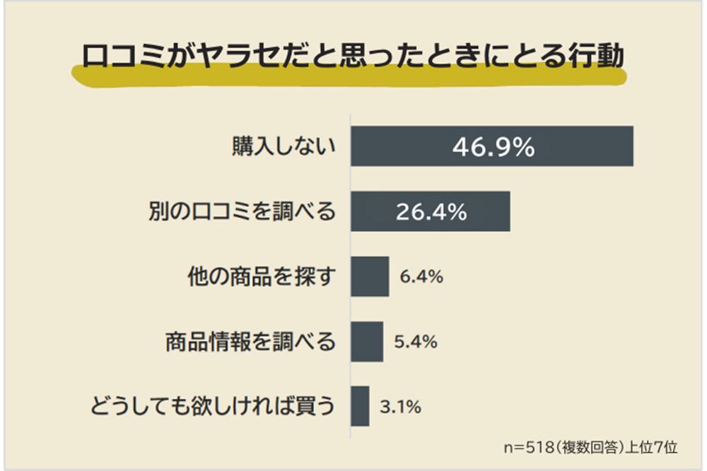 これらの意見は、ヤラセを判断するための指標にもなる。ヤラセと疑われる口コミを見た人は、およそ50パーセントが「購入しない」と答えている。ヤラセ口コミをなくすのは難しい。規制を加えても、不届き者はあの手この手でかわしてくる。その点では、「まだ使ってませんが、楽しみです!」なんて何の足しにもならない口コミが載っている商品は、逆に信用できるかも。
