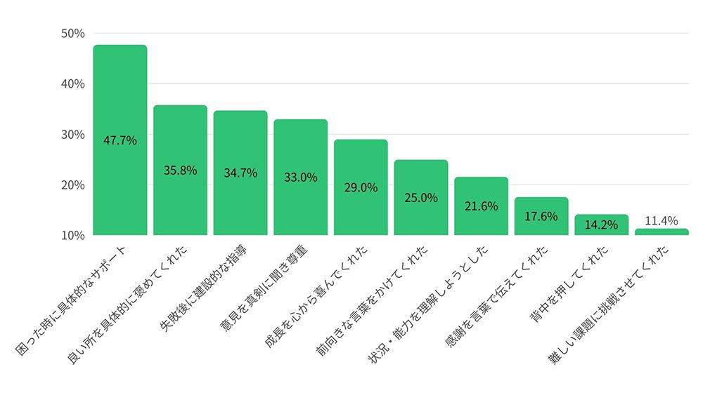 もっとも多かった回答は、困ったときに具体的なサポートをしてくれたことだ。続いて、よいところを具体的に褒めてくれた、失敗後に建設的な指導をしてくれた、意見を真剣に聞き尊重してくれたなど。