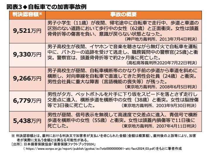 図表3は自転車での加害事故例をまとめたものだが、小学5年生の子どもが自転車を運転していて60代の女性に衝突したケースでは、運転していた子どもの母親に対して9521万円の賠償が命じられている。