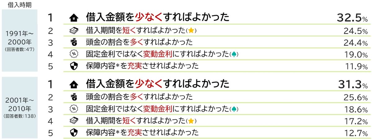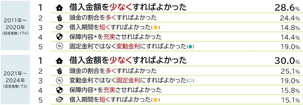 この結果を借り入れ期間別に集計すると、トップは変わらないものの、古い時期に借り入れた人々は「借入期間を短くすればよかった」が2位になっている。また、2010年以前に借り入れた人々からは「固定金利ではなく変動金利にすればよかった」という意見が目立つ。逆に、2021年~2024年に借り入れた人々は「変動金利ではなく固定金利にすればよかった」という意見を持っており、借り入れ時期によって、固定金利と変動金利の選択の難しさがうかがえる。