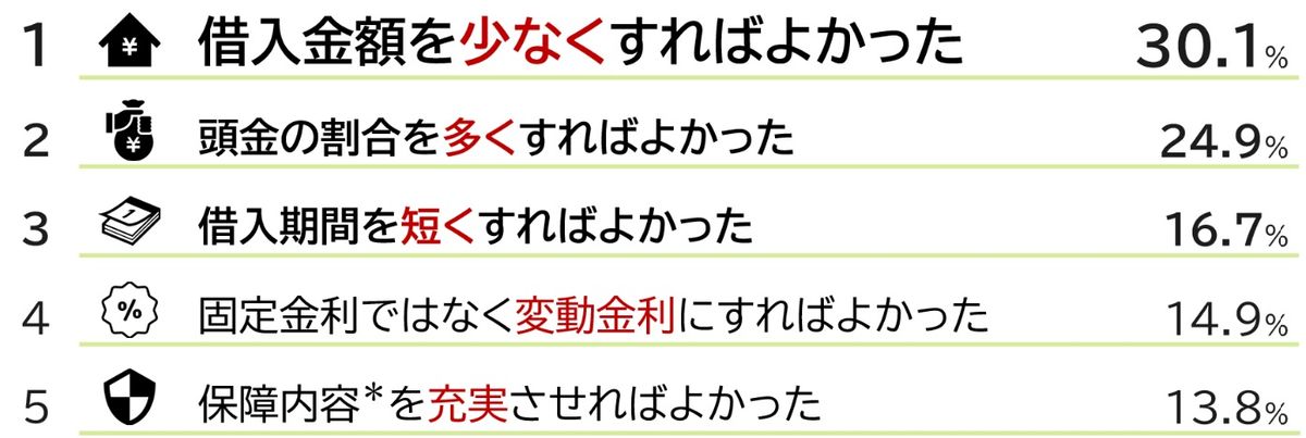 具体的に、どのような点に後悔しているのかというと、「借入金額を少なくすればよかった」が30.1%でトップ。次いで、「頭金の割合を多くすればよかった」が24.9%、「借入期間を短くすればよかった」が16.7%となっている。