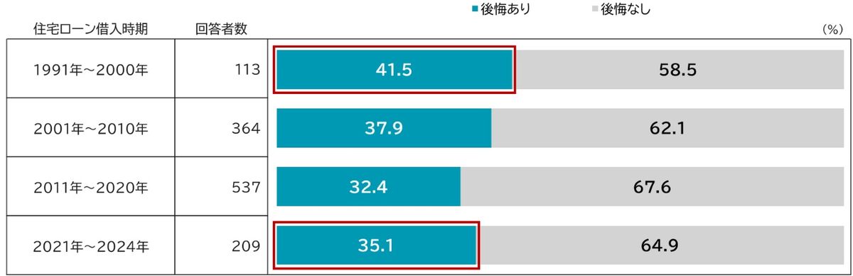 これを借り入れ時期別に集計すると、最も多かったのは1991年~2000年で44.5%だった。その後は徐々に割合が減少しているものの、2021年~2024年と比較的最近に借り入れた人々の間で、再び割合が増加傾向にある。