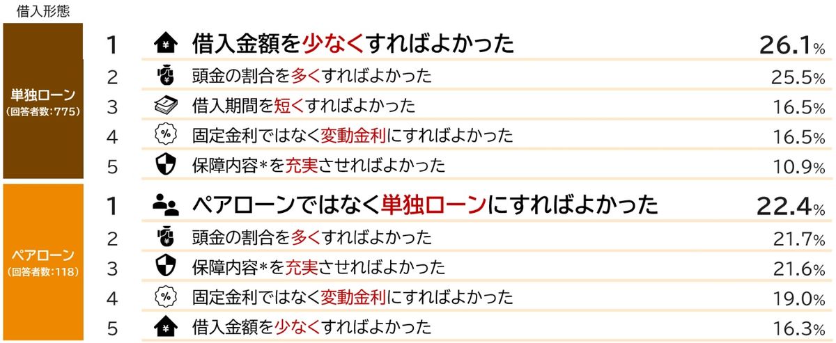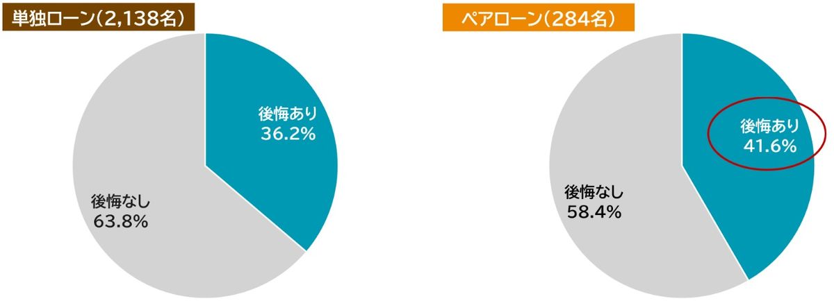 また、借り入れの状態を単独ローンとペアローンで分析すると、ペアローンの方が後悔している人が多いことが分かった。そして、ペアローンを組んでいる人の中で「ペアローンではなく単独ローンにすればよかった」と後悔する人が最も多く、「保証内容を充実させればよかった」という意見も21.6%で3位となっており、借主が2人となるペアローンの難しさも浮き彫りになった。
