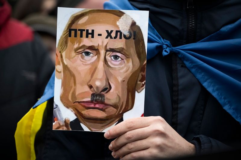ポーランドのワルシャワにあるロシア大使館の前で2023年1月22日、ウクライナの「統一の日」にあわせて行われた抗議デモ(Jaap Arriens/NurPhoto via Getty Images)