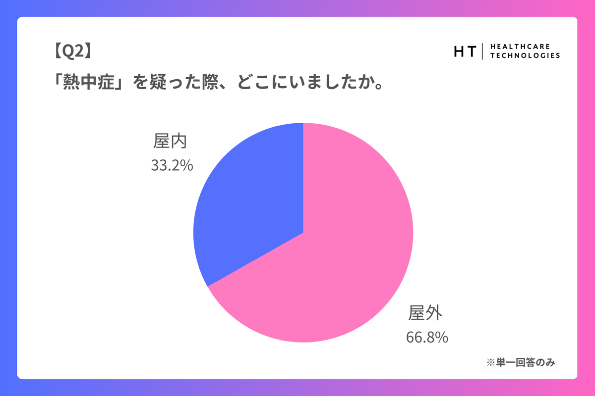 熱中症が発生した場所については、「屋外」が66.8%で最多だったものの、「屋内」も33.2%と3分の1を占めた。この結果は、熱中症が炎天下での活動時だけでなく、エアコンの効かない室内や湿度の高い環境でも起こりうることを示している。