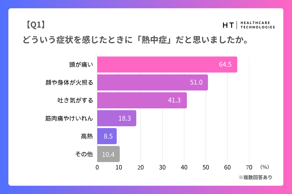調査で熱中症の症状として最も多く報告されたのは「頭が痛い」で64.5%。次いで「頭や身体が火照る」が51.0%、「吐き気がする」が41.3%と続いた。これらの症状は日常的な体調不良と似ているため、熱中症として認識されにくい可能性がある。