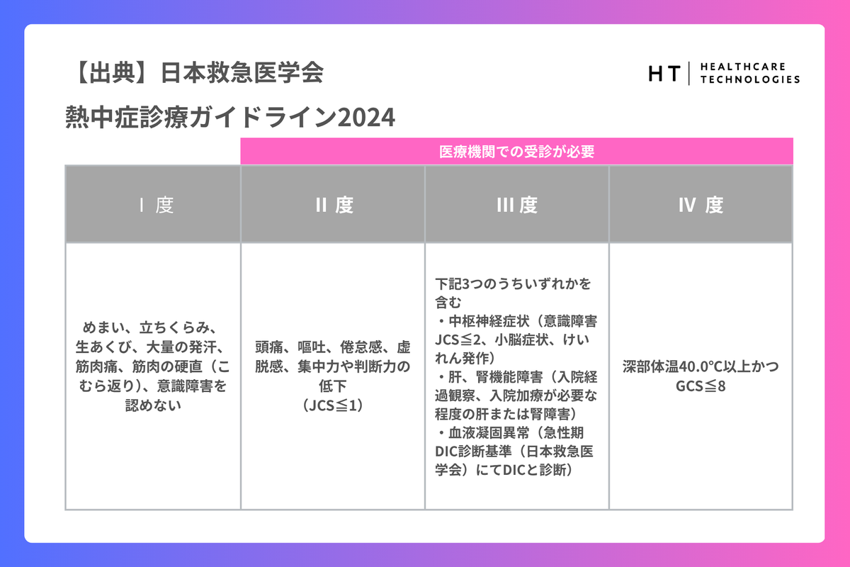 しかし、実は「頭痛」や「吐き気・嘔吐」といった症状は、日本救急医学会が定める熱中症の重症度分類において、Ⅱ度に該当する注意すべき重要な兆候だ。Ⅱ度は、気づかぬうちに重症化してしまう可能性があるため、速やかな医療機関の受診や医療者の判断が求められる状態とされている。