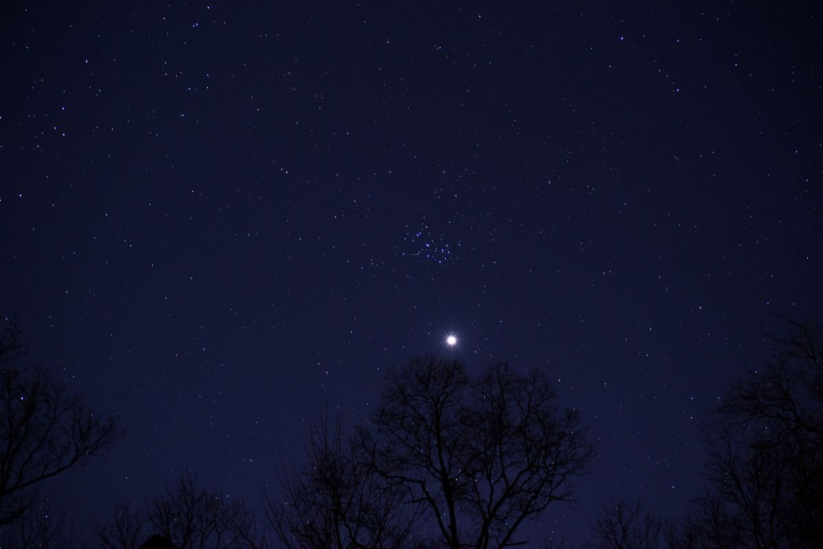 日没後、夜の帳が下りる頃に西の方角を見ると、月齢5.7のふくよかな弓形の月が空にかかり、その右斜め下に赤い火星と青白い1等星レグルスがある。レグルスはしし座で最も明るい星で、地球から約70光年離れている。