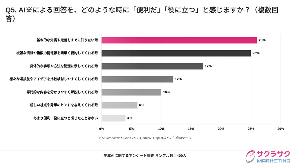 「AIによる概要」を含む生成AIツールが便利だと思うのは、「基本的な知識や定義をすぐに知りたいとき」や「複雑な情報や複数の情報源を素早く要約してくれるとき」などがあげられた。