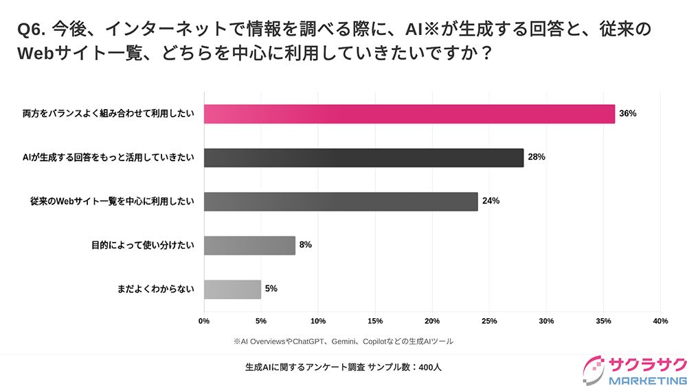 今後、「AIによる概要」を含めChatGPTやGeminiなどの生成AIツールと検索エンジンのどちらを使いたいかという質問では、36パーセントの人が両方をバランスよく使いたいと答えている。まさに、それが正解だ。