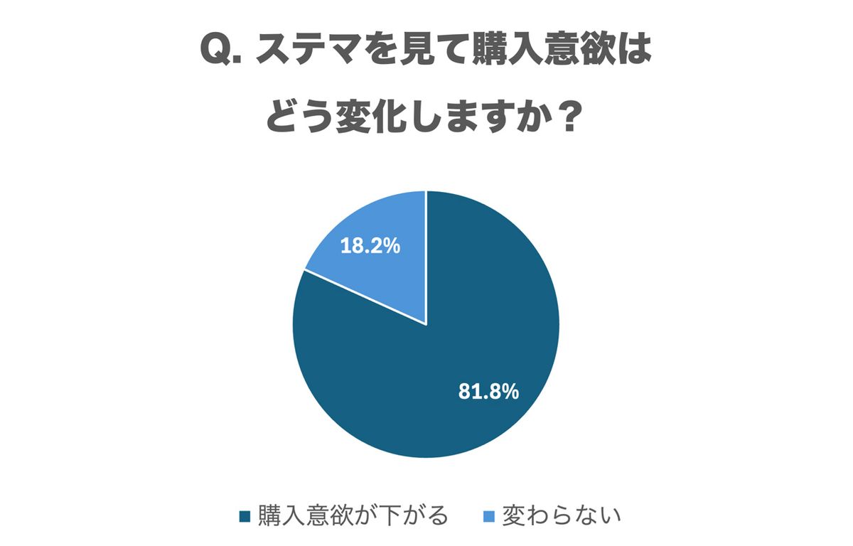 また、ステマを見て購入意欲はどう変化したかについては、「購入意欲が下がる」が81.8%を占め、ステマが逆効果であることが示された。