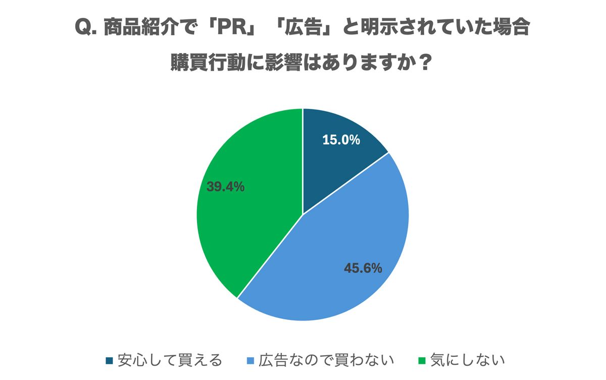 一方、商品紹介で「PR」「広告」と明示されていた場合、購買行動に影響があるかについては、「広告なので買わない」が45.6%を占めており、企業にとっては広告だと謳いたくない気持ちが働くことから、ステマがなくならないのではないかと推測される。