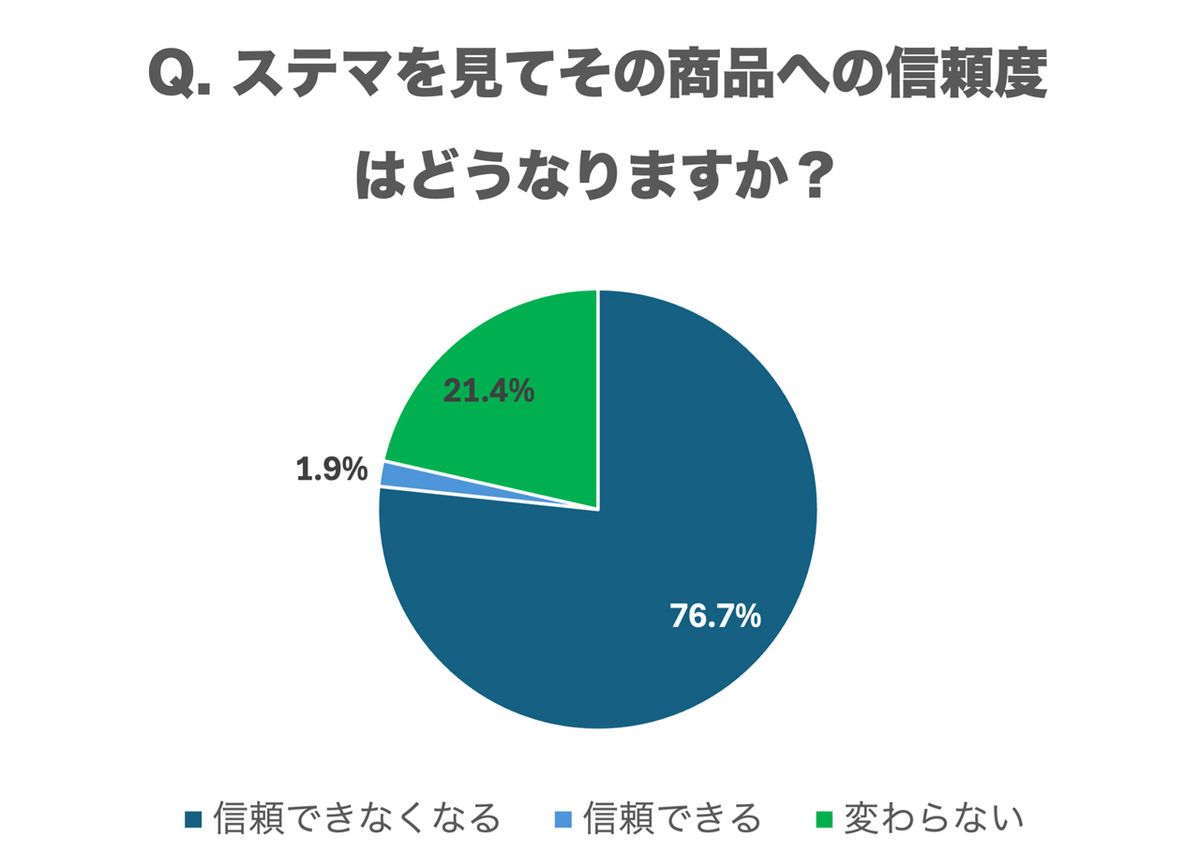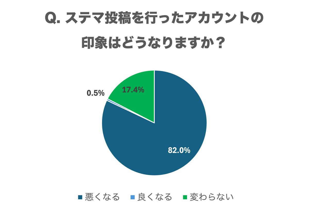 ステマを見てその商品への信頼度はどうなるかについても、76.7%が「信頼できなくなる」と回答し、ステマ投稿を行ったアカウント(企業やインフルエンサー)の印象についても、82.0%が「悪くなる」と回答した。