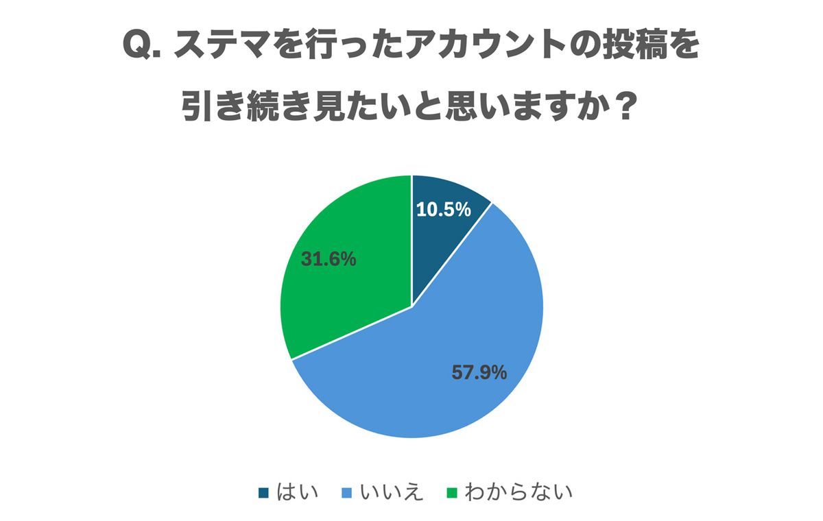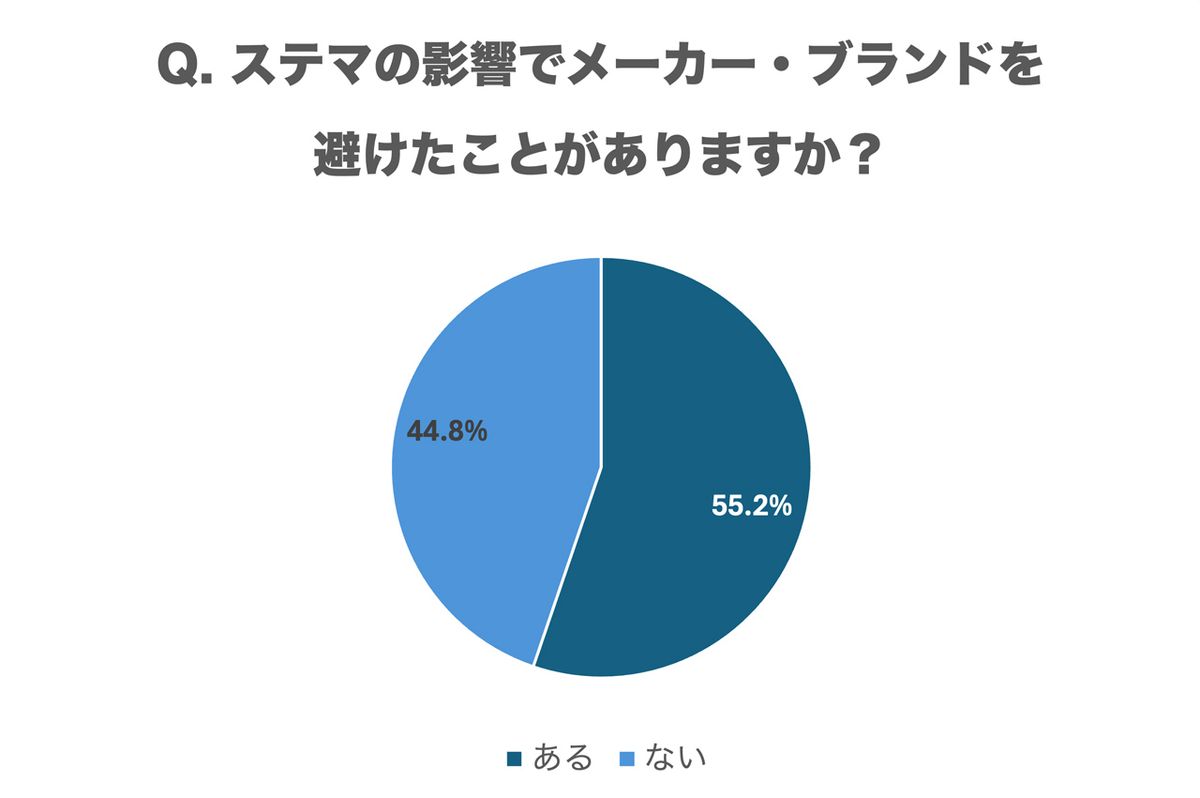 こうした結果、ステマを行ったアカウントの投稿を引き続き見たいと思うかについて、57.9%の人が「いいえ」と回答。ステマの影響でメーカー・ブランドを避けたことがあるかの問いに対しても、55.2%の人が「ある」と回答しており、企業もステマ行為をしたインフルエンサーも、信頼性を失う可能性が高いことがうかがえる。