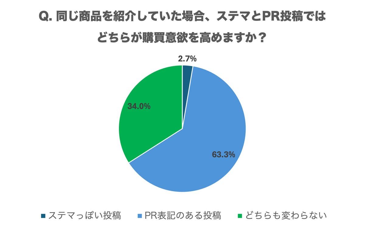しかし、同じ商品を紹介していた場合、ステマとPR投稿ではどちらが購買意欲を高めるかの問いには、「PR表記のある投稿」が63.3%を占めており、ステマよりはPR表記したほうが結局いいということもわかった。