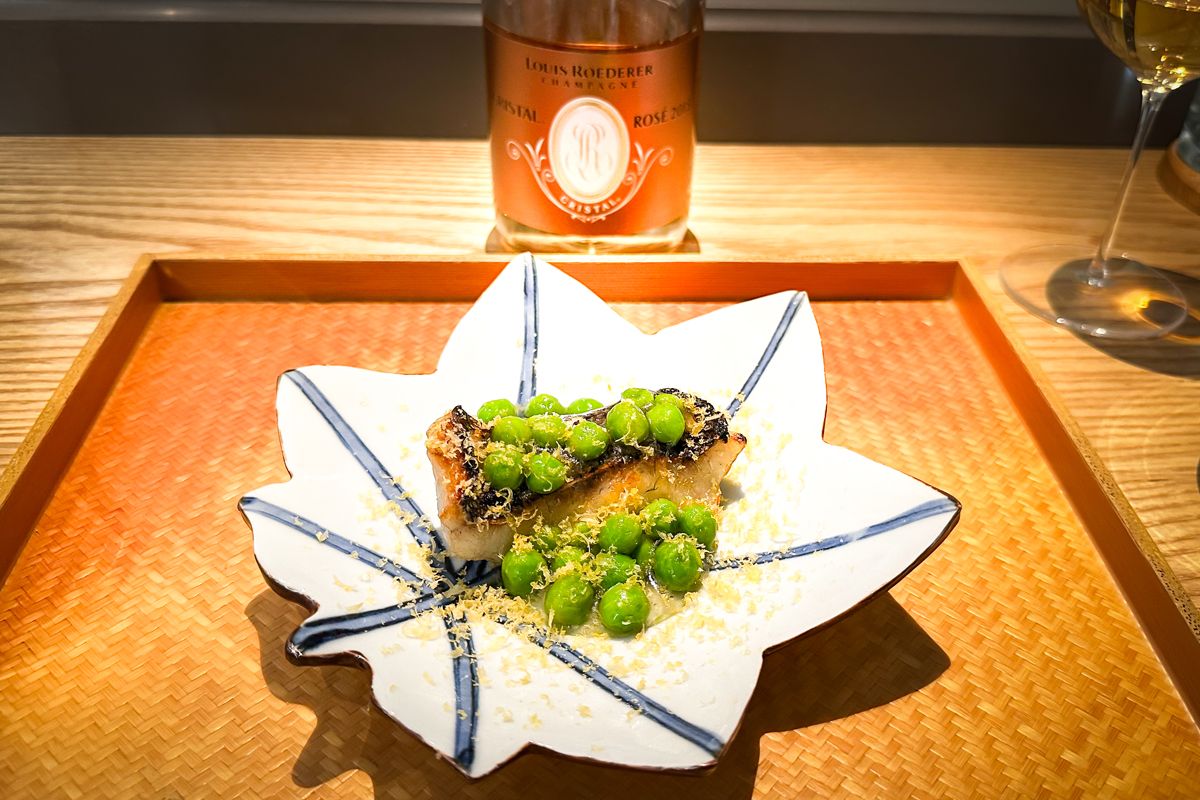 もう一つ、レカイヨン氏が「対比」のペアリングとして感銘を受けた料理が、「フエフキダイの焼き物」。炭火焼の魚に、プティポワ(グリーンピース)のソースとカラスミがかけられ、山椒のアクセントが加わった一品だ。