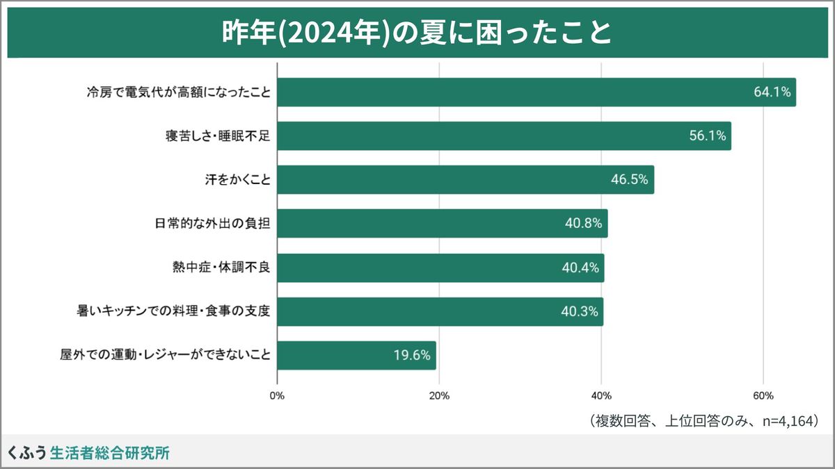 調査で昨年の夏の困りごとを尋ねたところ、「冷房で電気代が高額になったこと」が64.1%で最多となった。次いで「寝苦しさ・睡眠不足」(56.1%)、「汗をかくこと」(46.5%)が続き、暑さそのものと同程度に電気代への不安が大きな問題となっている実態が浮かび上がった。