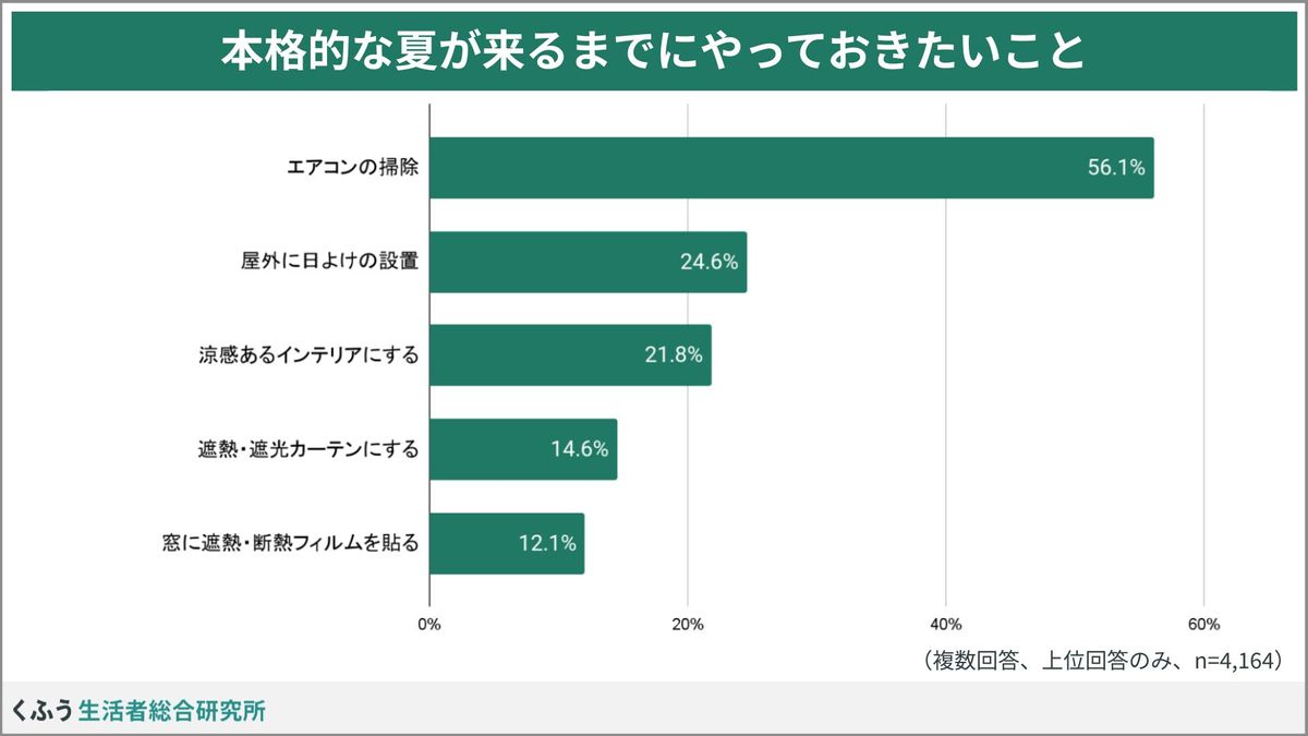 本格的な夏に向けた準備として最も多く挙げられたのは「エアコンの掃除」で56.1%。これは単なる快適性の向上だけでなく、掃除によってエアコンの効率を高め、電気代を抑制したいという意図も含まれていると考えられる。