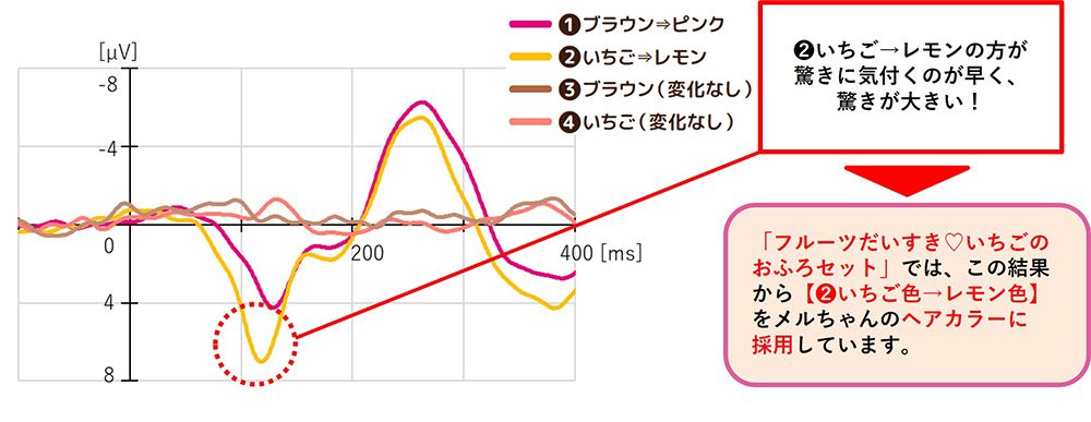 パイロットは、東海光学、愛知県医療療育総合センターと共同で、6〜10歳の子ども37人を対象に、メルちゃんの髪の色の変化に脳がどう反応するかを調査した。それによると、髪の色が変わるだけで驚きが検知されるが、いちご色からレモン色への変化では、変化の気づきが早く、驚きがもっとも大きいことがわかった。