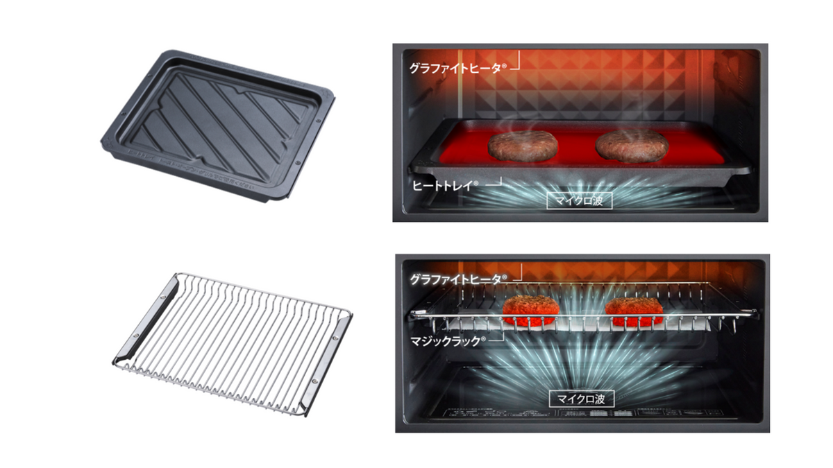 調理メニューは「リベイク」「解凍」「グリル」「トースト」など8種類を搭載し、全55品を掲載したレシピブックが付属。また、マイクロ波に反応して高温になることで食材を裏面からもしっかり加熱できる「ヒートトレイ」と、金属製ながらレンジ加熱でも使用できる「マジックラック」という2種類の専用付属品も用意される。