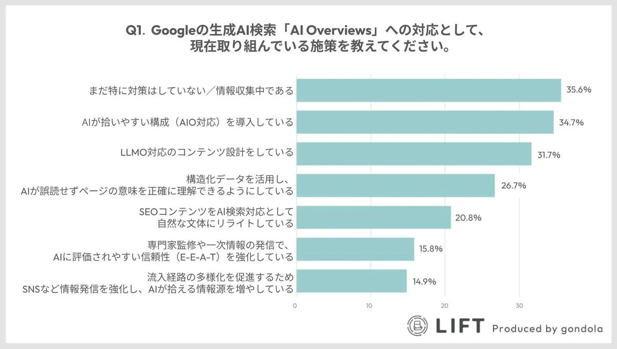 そんなSEO対策と影響について、マーケティングメディア「LIFT」を運営するゴンドラが「AI OverviewsによるSEO影響と対応実態」に関するアンケート調査を実施し、結果を公開している。