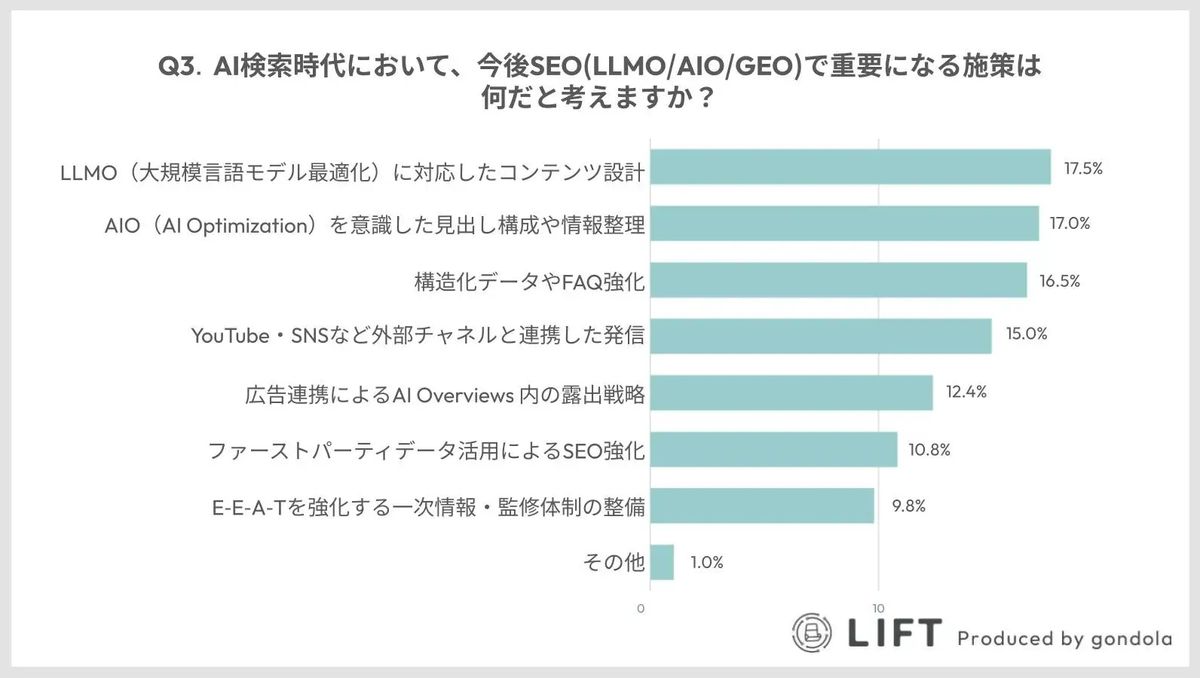 AI検索時代において、今後SEOで重要になる施策は何かの問には、「LLMOに対応しコンテンツ設計」が17.5%、「AI Optimizationを意識した見出し構成や情報整理」が17.0%、「構造化データやFAQ強化」が16.5%などとなっている。AI経由の導線に対し、新たな測定手法が必要になっているようだ。
