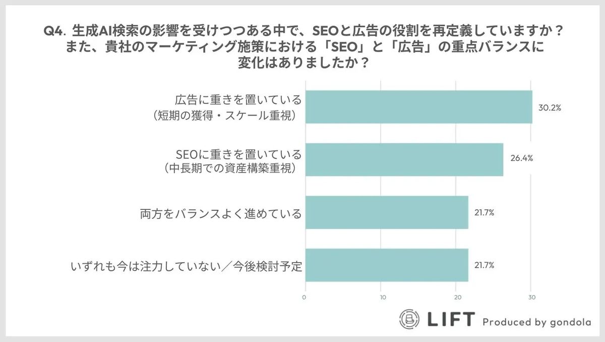 最後に生成AI検索の影響によりSEOと広告の役割を再定義したかについては、「広告に重きを置いている」が30.2%、「SEOに重きを置いている」が26.4%と、広告のほうが若干上回る結果となった。
