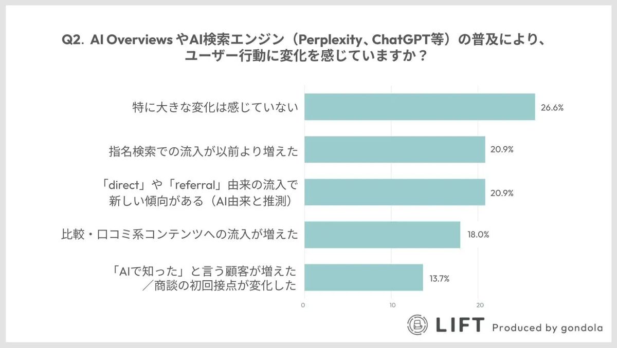 また、AI OverviewsやAI検索エンジンの普及により、ユーザー行動に変化を感じているかについては、「特に大きな変化は感じていない」が26.6%、「指名検索での流入が以前より増えた」「direct/referral由来の流入で新しい傾向がある」が20.9%と続いている。変化を感じていない人はまだ多いものの、これまでとは異なる傾向に薄々気づいている企業も増えてきているようだ。