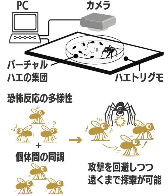 すると、個体間のフリージング時間に多様性があり、かつ個体間で同調が生じる条件の場合、ハエはクモに襲われにくく、遠くまで逃げられることが判明した。ハエ集団は、多様な仲間の行動に同調する「相互作用」によって、より安全に生き延びることが可能になるということだ。