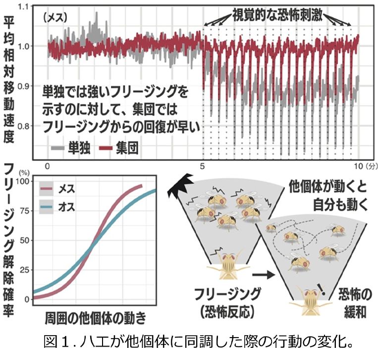 千葉大学国際高等研究基幹・大学院理学研究院の佐藤大気特任助教、高橋佑磨准教授による研究チームは、ショウジョウバエが敵に遭遇したとき、周囲の個体の行動に影響を受けることを発見した。ハエは天敵が近づくと恐怖反応により瞬間的に動きが止まる「フリージング」の状態となる。そのときの様子を観察すると、単独のときは強いフリージングを示すが、集団では自分よりも早くフリージングが解けた仲間を見て自分も動き始める「同調」的な行動が見られた。それにより恐怖反応が緩和されるという。