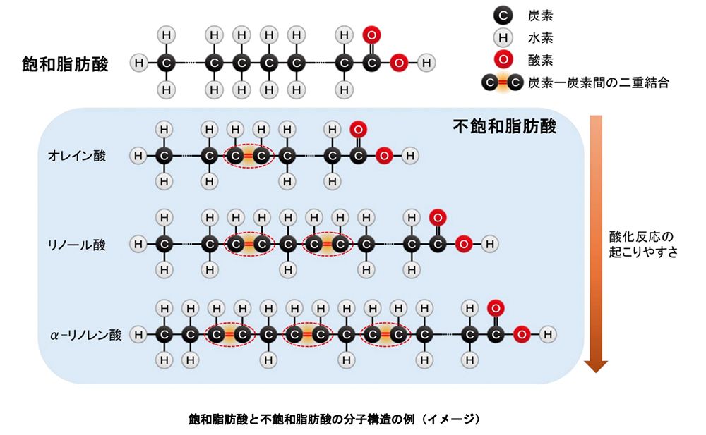 油のなかでも発火しやすいのが、オレイン酸、リノール酸、α-リノレン酸を含むものだ。これらは不飽和脂肪酸と呼ばれ、炭素の二重結合を含むため酸素と反応しやすい。これらを含む油を染み込ませた雑巾などを高温環境に放置しておくと、酸素と反応して酸化熱が生じる。さらに放置すれば熱が蓄積され、やがて発火点に達して燃え上がる。