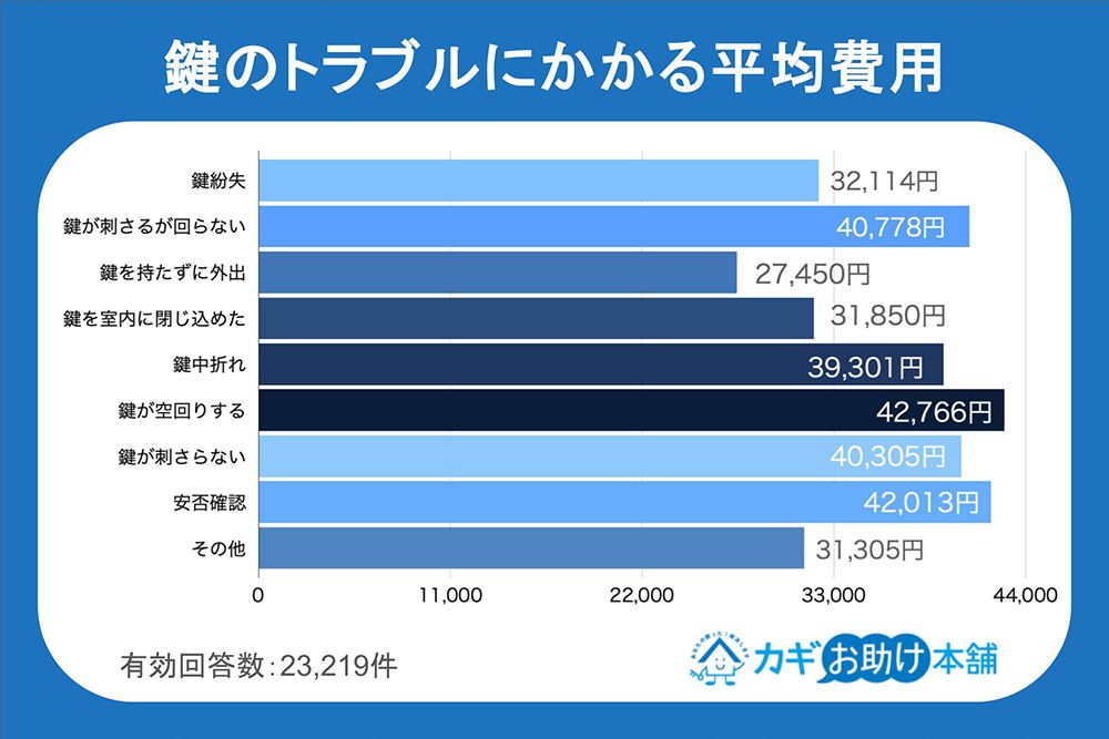 さて問題は鍵を開けてもらったときの費用だが、カギのお助け本舗の集計では平均3万3402円。これには錠前の修理や交換といった高額な工事費も含まれるが、カギの紛失でも平均3万2114円とかなり痛い出費となる。