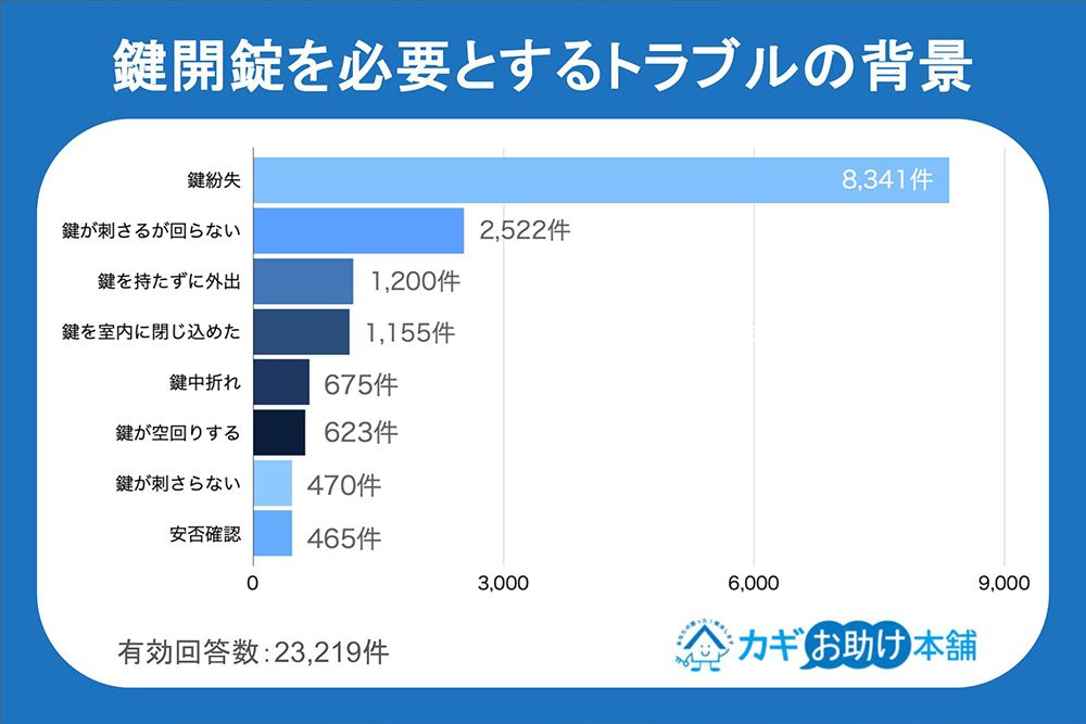 鍵開錠の内容は、鍵の紛失、鍵を持たずに外出したがその間に家族が出かけて鍵を掛けられた、家の中に鍵を置いたままロックしてしまった、というものだが、圧倒的に鍵の紛失が多い。