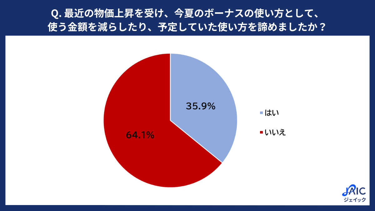 物価上昇の影響も無視できない要素となっている。物価高を受けてボーナスの使い方を変更したかを尋ねたところ、35.9%が「使う金額を減らしたり、予定していた使い方を諦めたりした」と回答した。4割弱の人が物価高の影響でボーナスの使い方に何らかの変化を余儀なくされている実態が浮かび上がった。