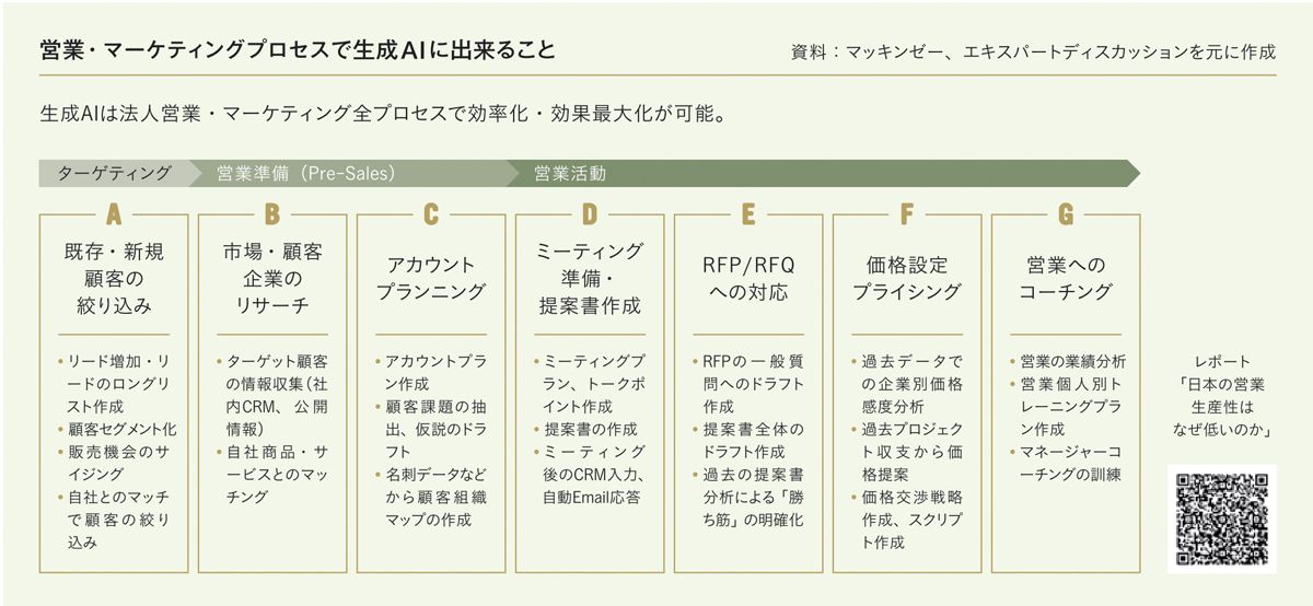 第一に、生成AI活用だ。生成AIはもはや先進企業だけのものではなく、広く普及し始めている(図表参照)。しかし、営業現場への浸透度には企業間で大きな開きがある。この差の 最大の要因は、経営陣による投資のスピード、そして組織的な動きとして実装できるかどうか、である。