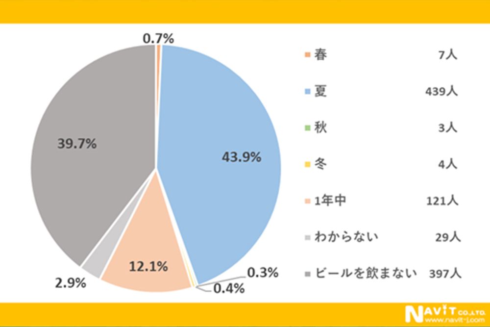 1年でビールを飲みたくなる季節をたずねると、やっぱり夏がダントツでトップ。「1年中」という答えが次に多かったことから、根っからのビール好きが多いこともわかる。