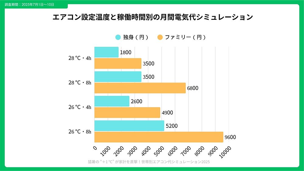 SONGは、全国の20〜40代の男女300人を対象に調査を行い、夏の気温が1度上がることでエアコンの1カ月あたりの電気代がどう変化するかを試算した。日本を北海道、関東、関西、九州の4つの地域に分けて、それぞれに独身世帯とファミリー世帯での電気代の違いを示している。独身世帯は1Kの賃貸物件に暮らす35歳。ファミリー世帯は3LDKの持ち家に暮らす30代の夫婦と子ども1人という家族構成をモデル世帯とした。気温は気象庁の地域別夏の平均値を基準にしている。
