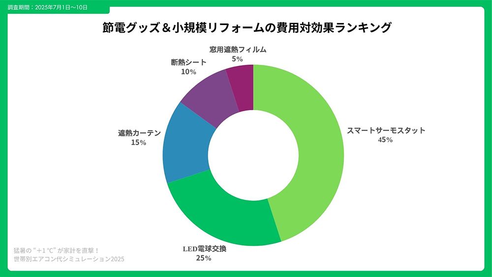 そこで、節電グッズまたは小規模リフォームの導入となるが、その費用対効果ランキングでは「スマートサーモスタット」がトップになった。あまり聞き慣れないモノだが、全館空調が基本の欧米の家屋では各部屋の壁に冷暖房のコントローラーがある。これがサーモスタットだ。ホテルの部屋の室温調節のアレと同じ。それをIoT技術で遠隔操作やプログラムを可能にするというものだ。